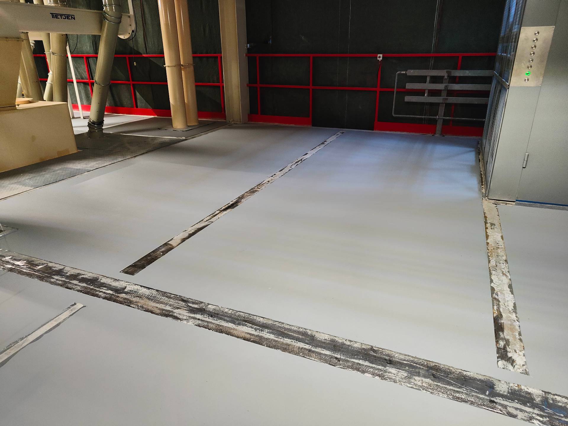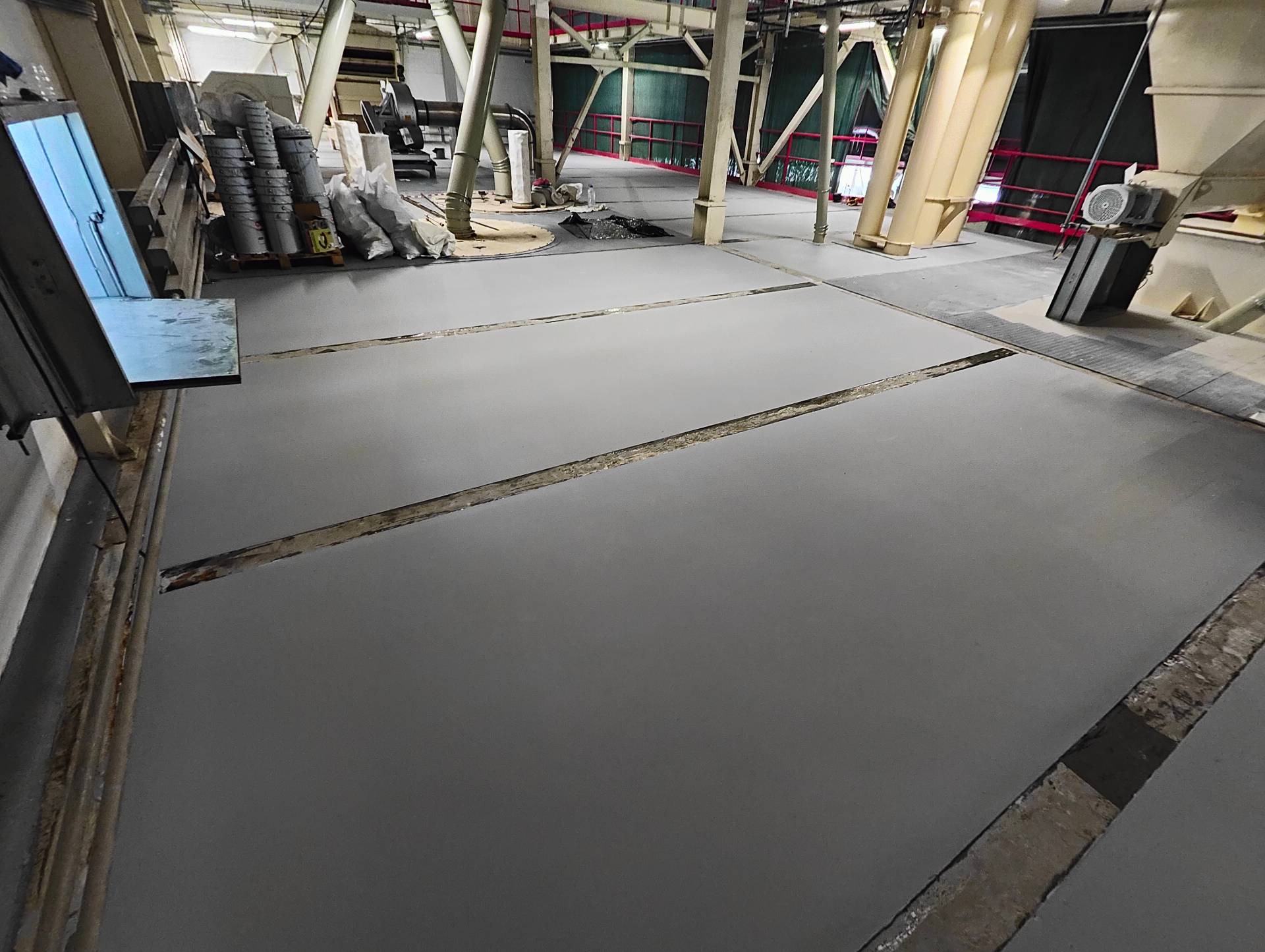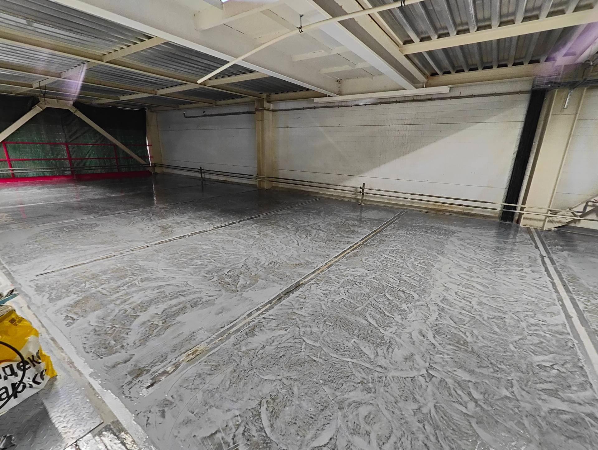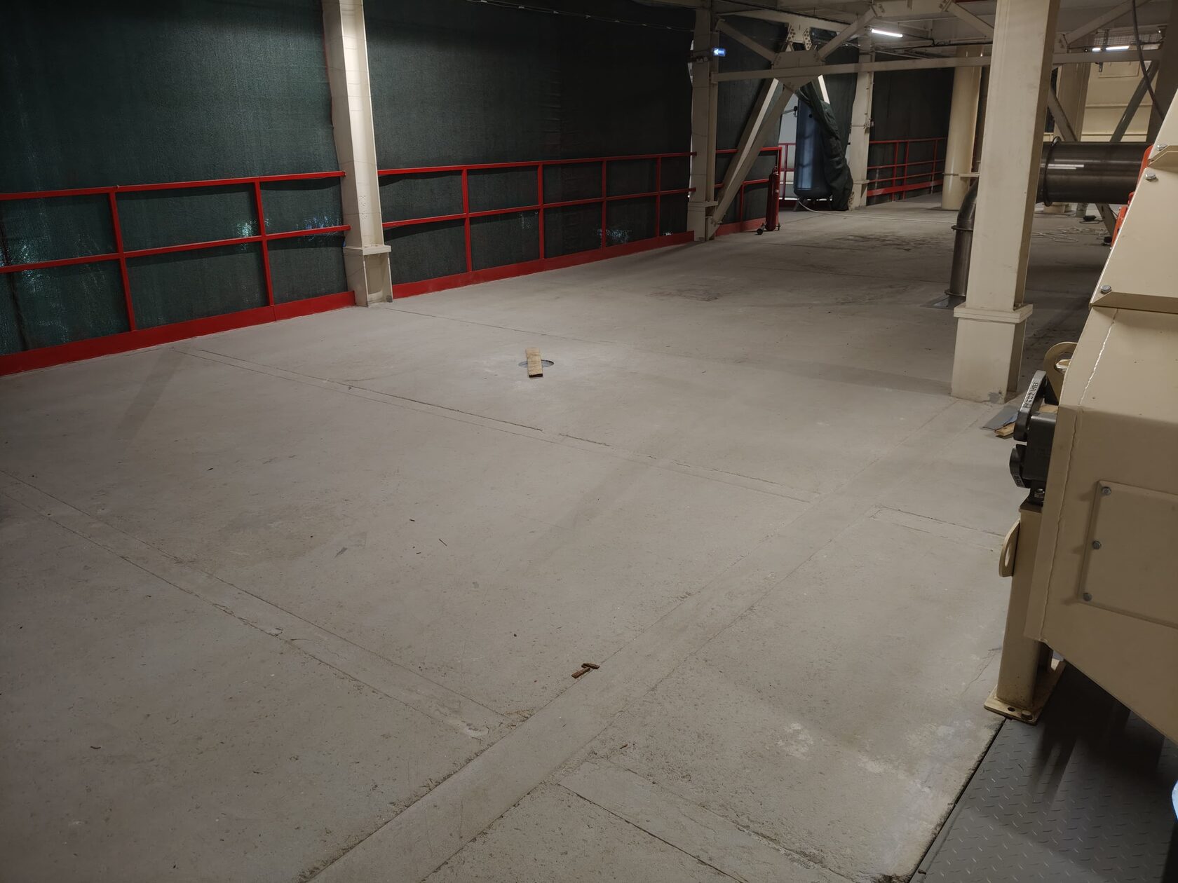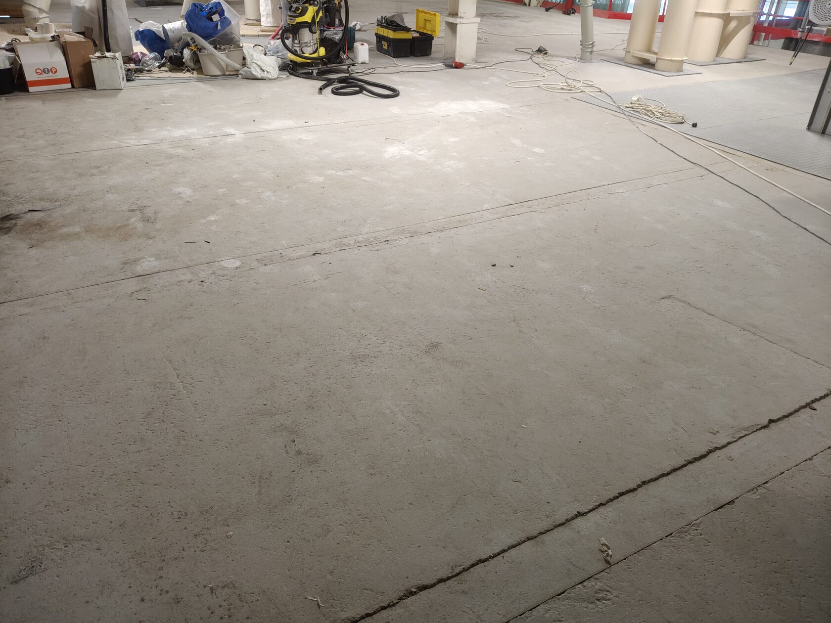 🔶 Вся площадь разделена на секции швеллерами. Была задача нанести покрытие, не заходя на швеллеры. Задача осложнялась тем, что края бетонных секций были неровные, и все примыкания нам пришлось вышлифовывать вручную. Также сложность заключалась в температуре в помещении и в том, что поверхность была покрашена.