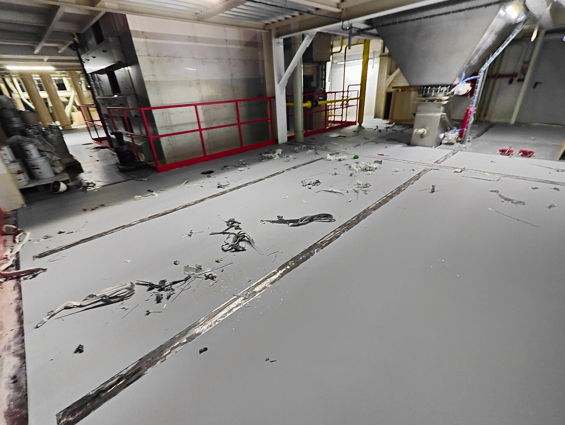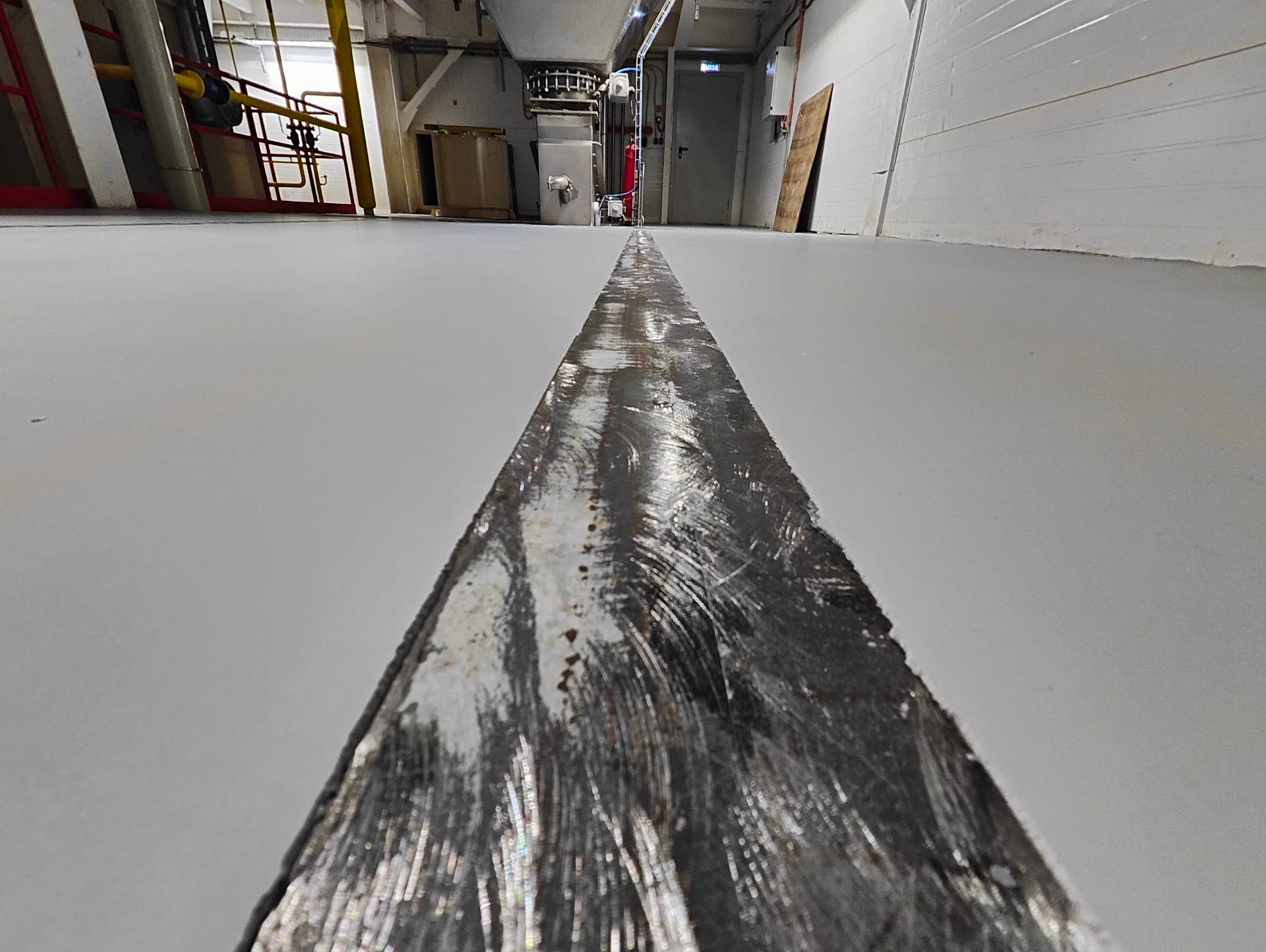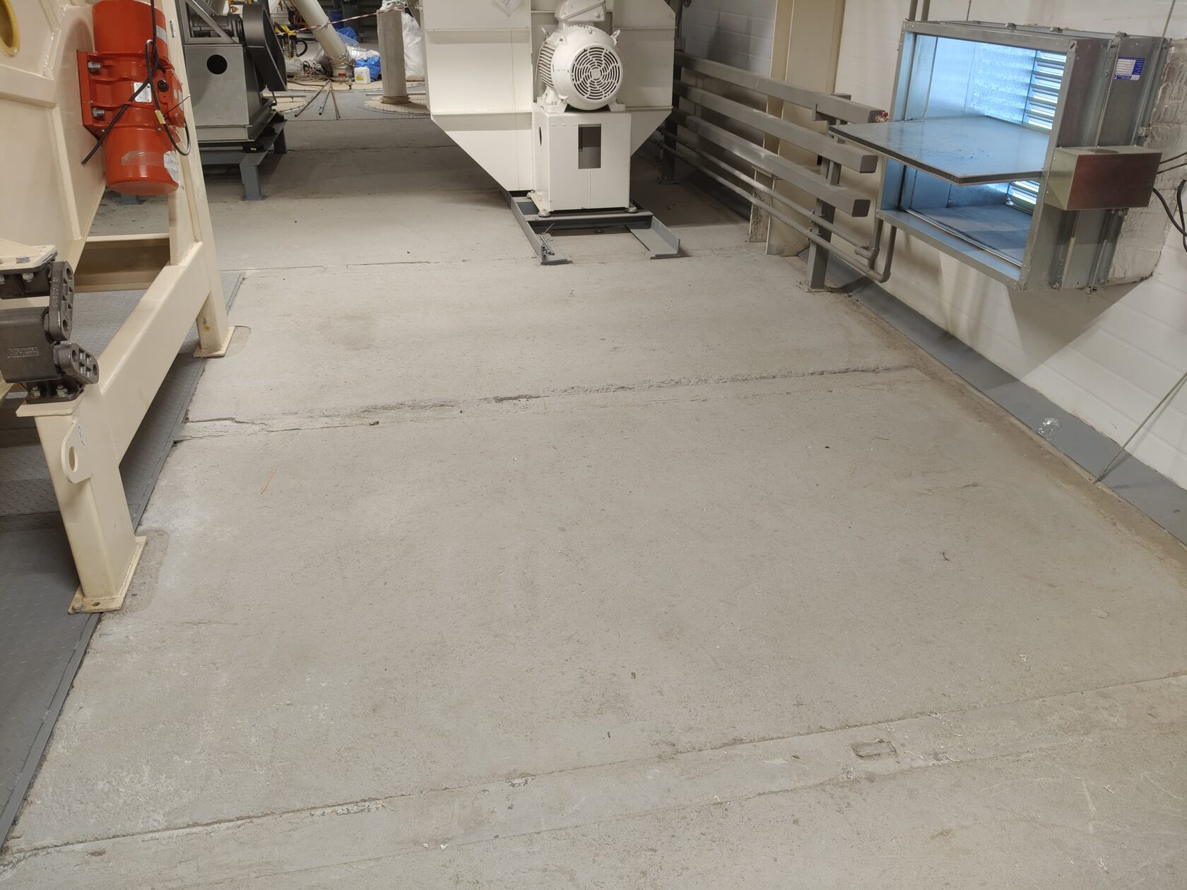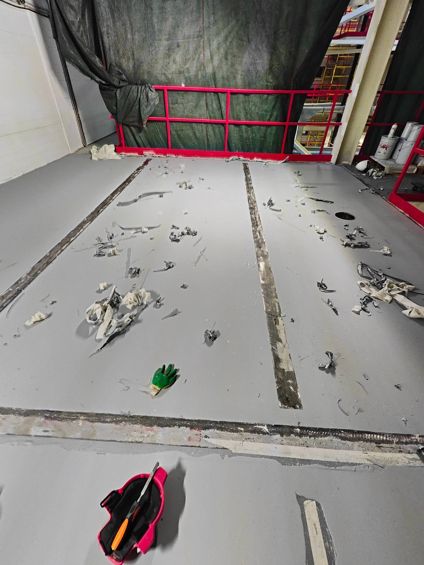 🔶 Вся площадь разделена на секции швеллерами. Была задача нанести покрытие, не заходя на швеллеры. Задача осложнялась тем, что края бетонных секций были неровные, и все примыкания нам пришлось вышлифовывать вручную. Также сложность заключалась в температуре в помещении и в том, что поверхность была покрашена.