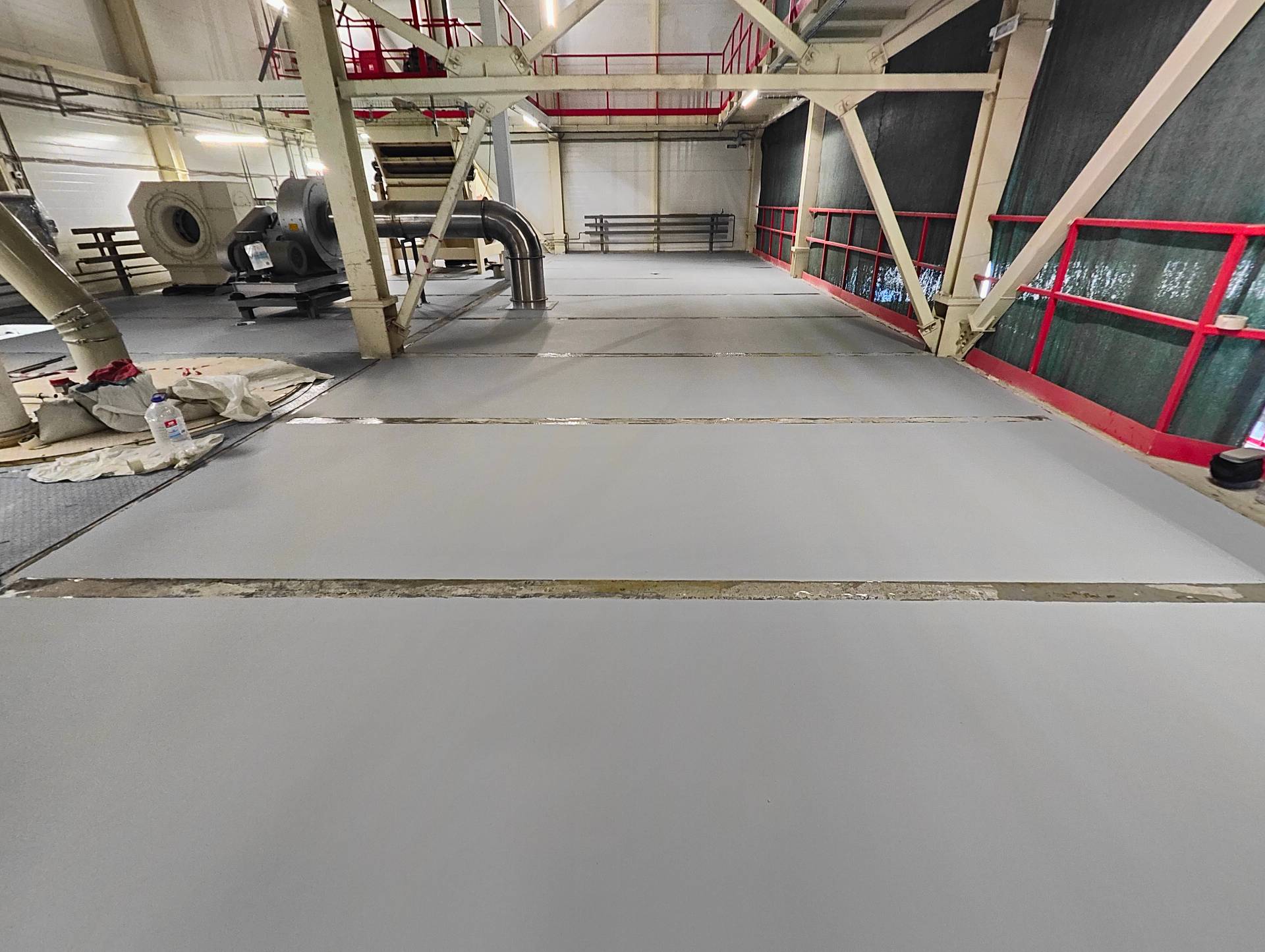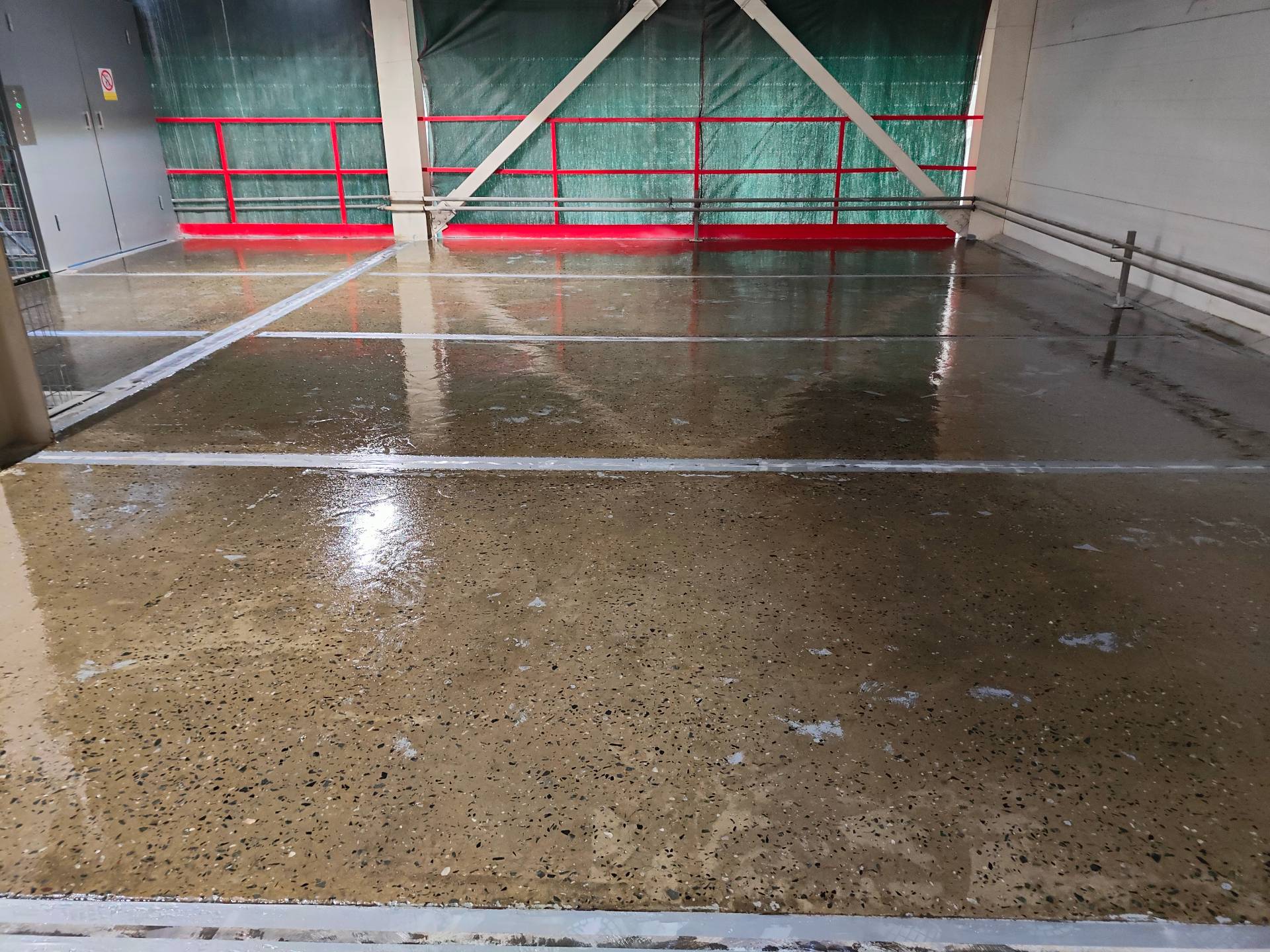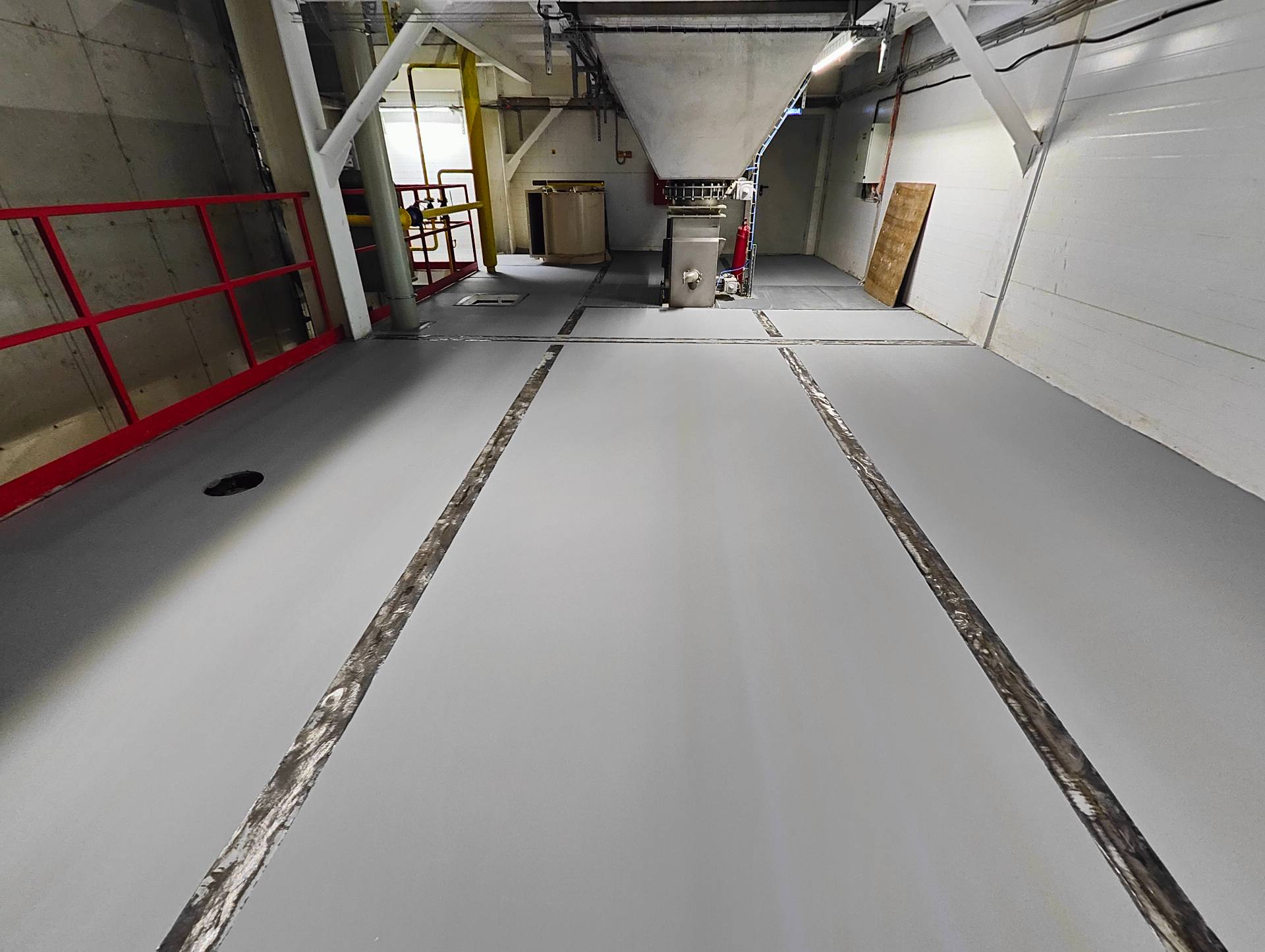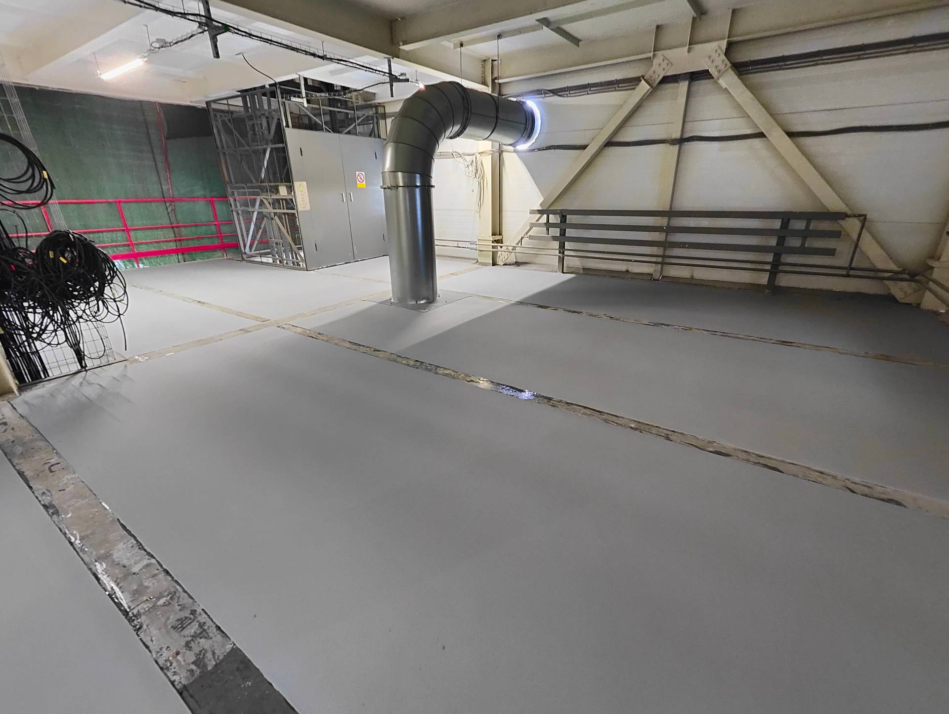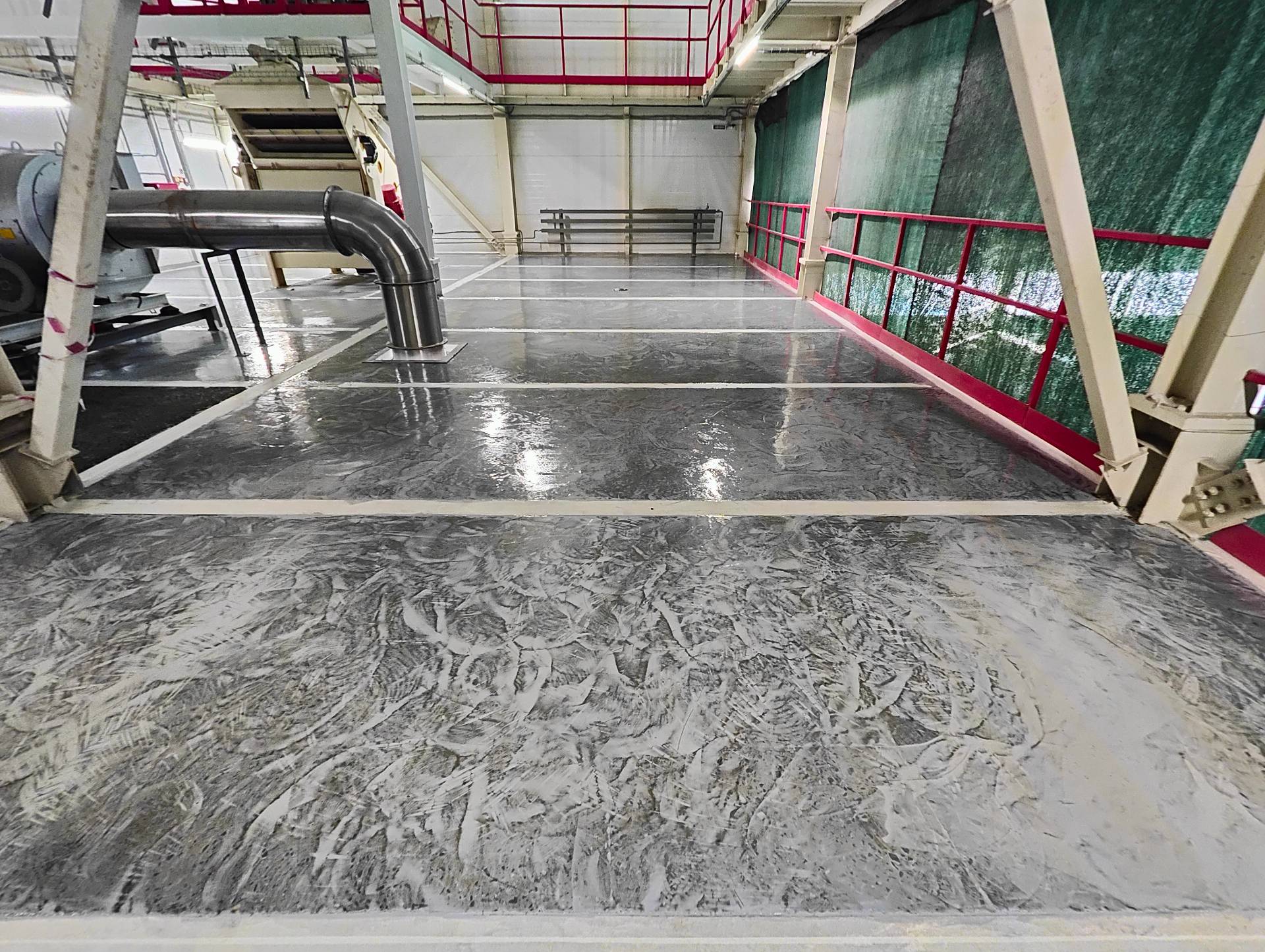 🔶 Вся площадь разделена на секции швеллерами. Была задача нанести покрытие, не заходя на швеллеры. Задача осложнялась тем, что края бетонных секций были неровные, и все примыкания нам пришлось вышлифовывать вручную. Также сложность заключалась в температуре в помещении и в том, что поверхность была покрашена.