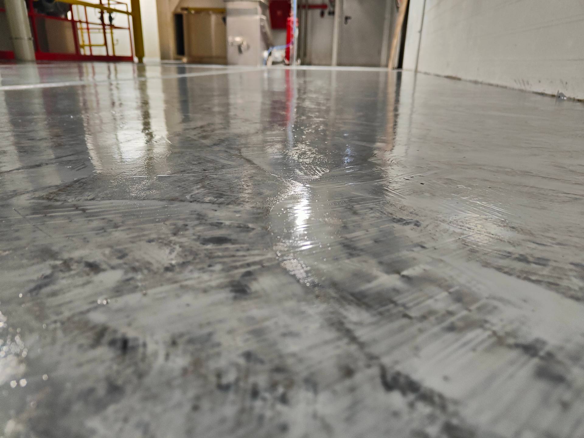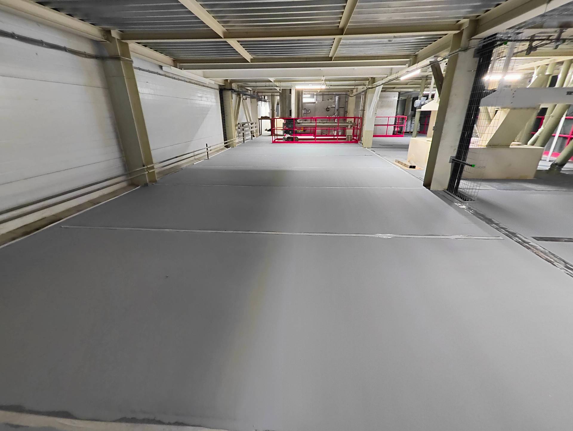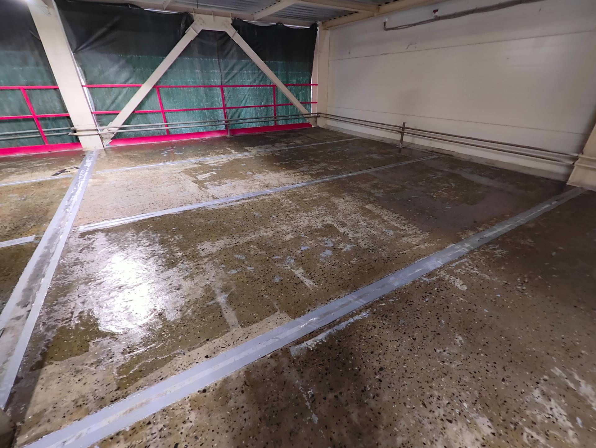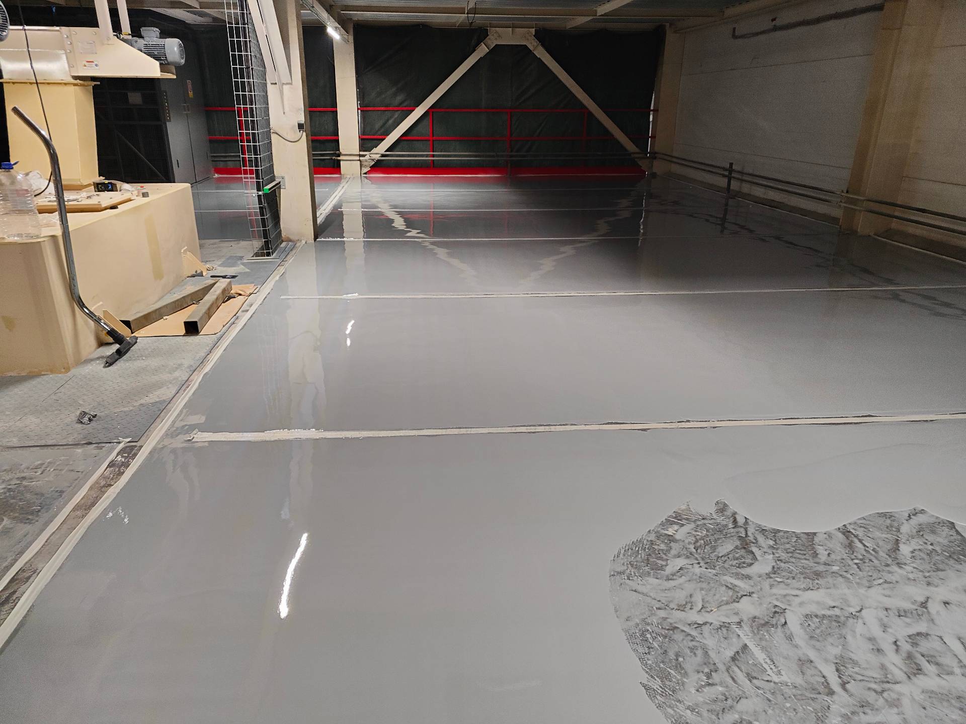 🔶 Вся площадь разделена на секции швеллерами. Была задача нанести покрытие, не заходя на швеллеры. Задача осложнялась тем, что края бетонных секций были неровные, и все примыкания нам пришлось вышлифовывать вручную. Также сложность заключалась в температуре в помещении и в том, что поверхность была покрашена.