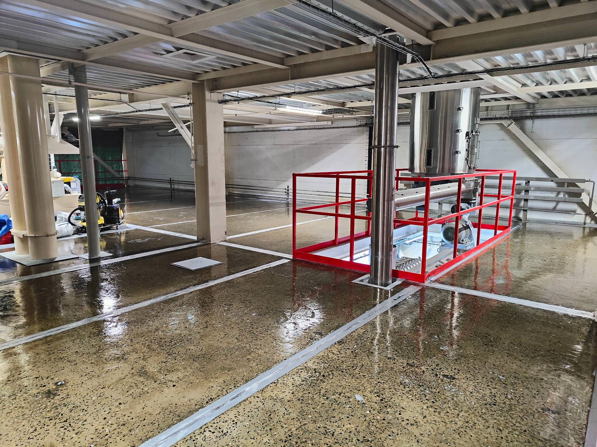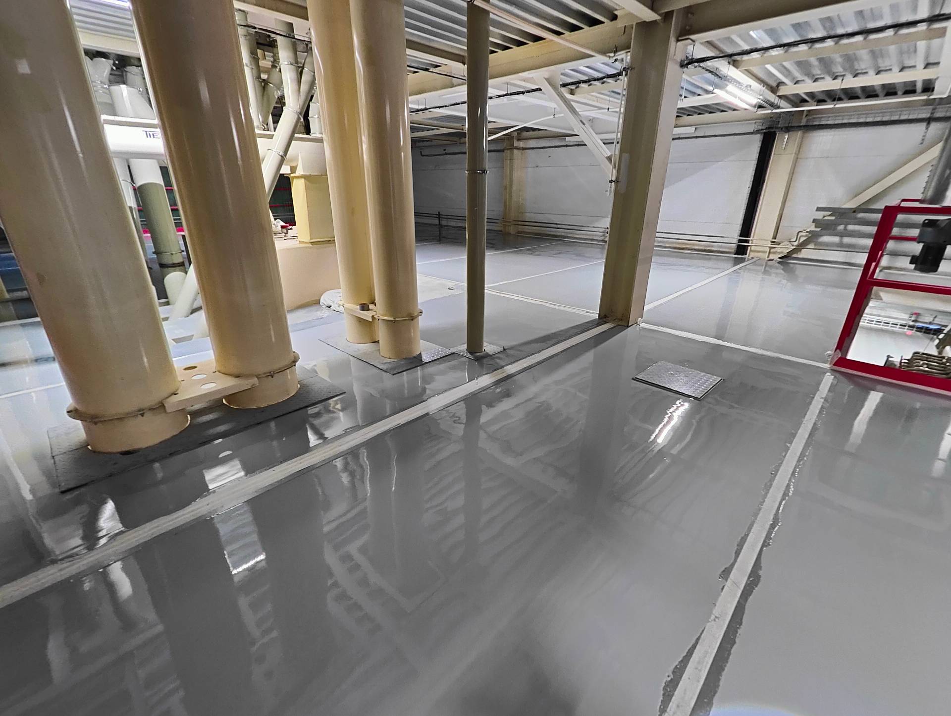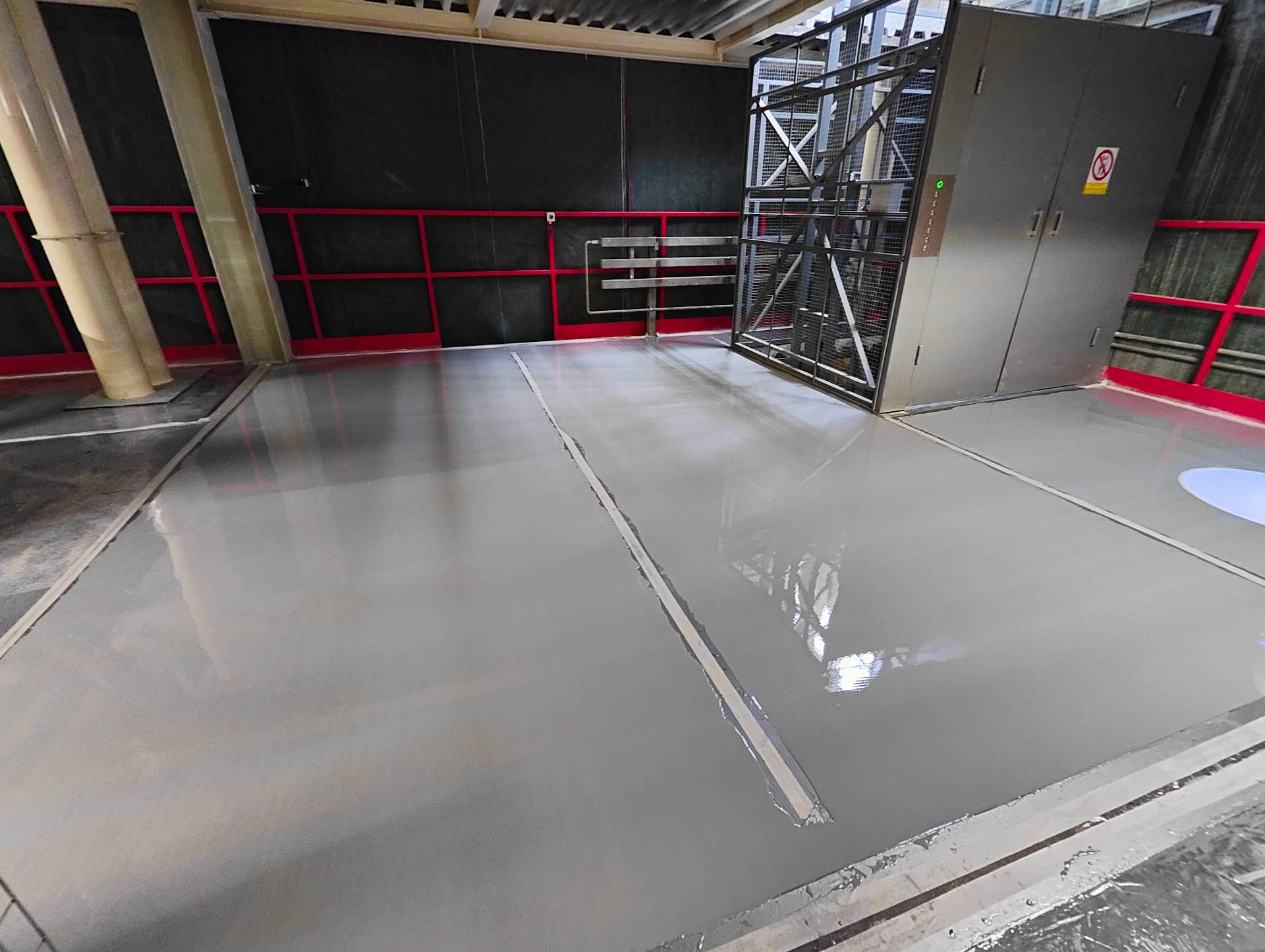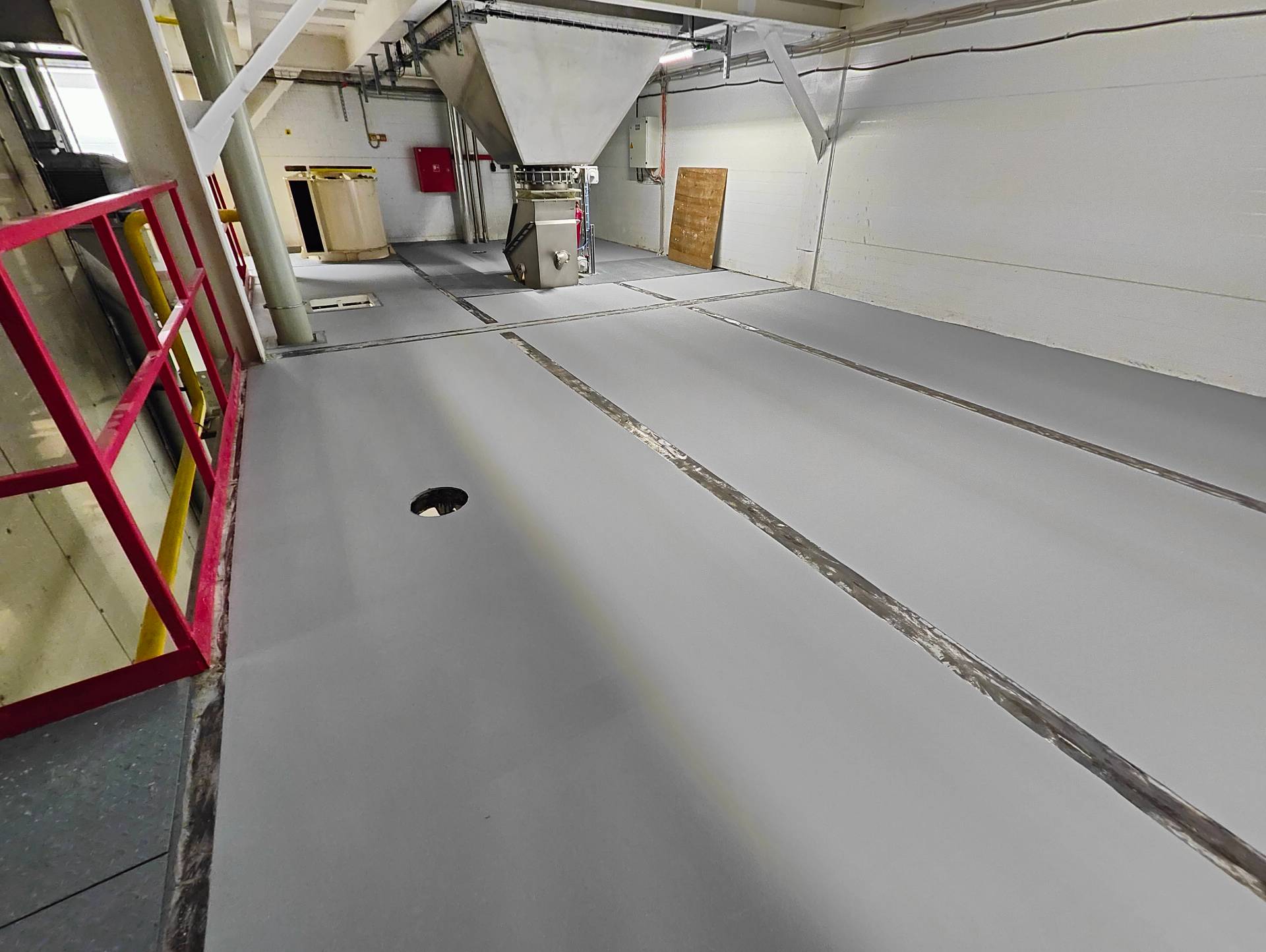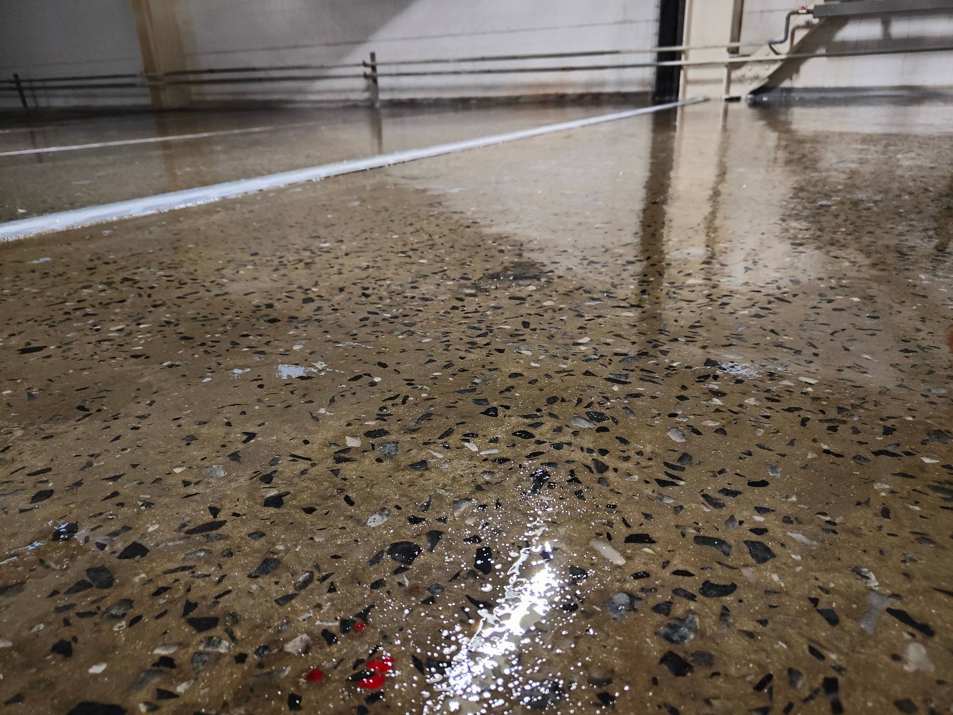 🔶 Вся площадь разделена на секции швеллерами. Была задача нанести покрытие, не заходя на швеллеры. Задача осложнялась тем, что края бетонных секций были неровные, и все примыкания нам пришлось вышлифовывать вручную. Также сложность заключалась в температуре в помещении и в том, что поверхность была покрашена.