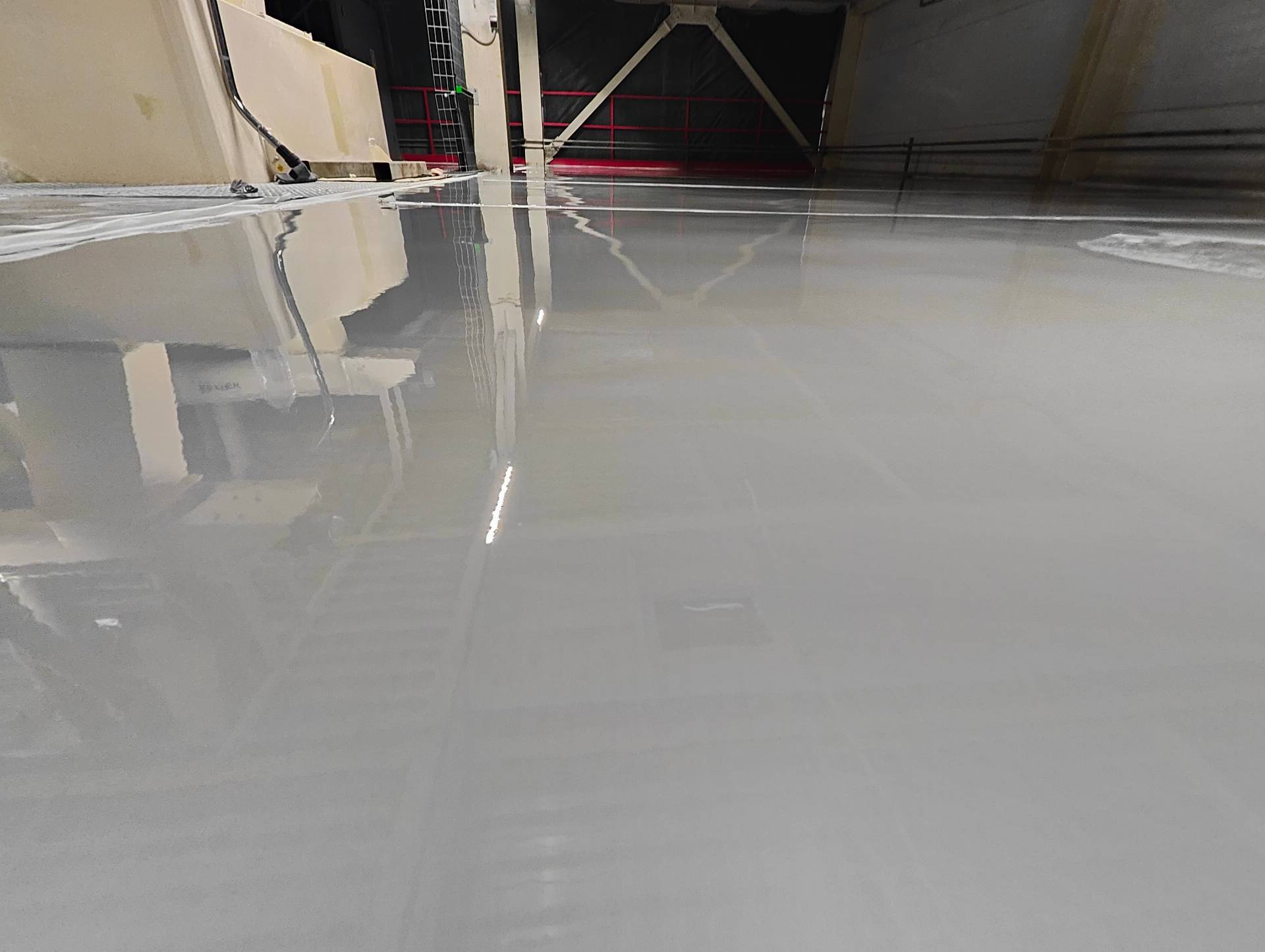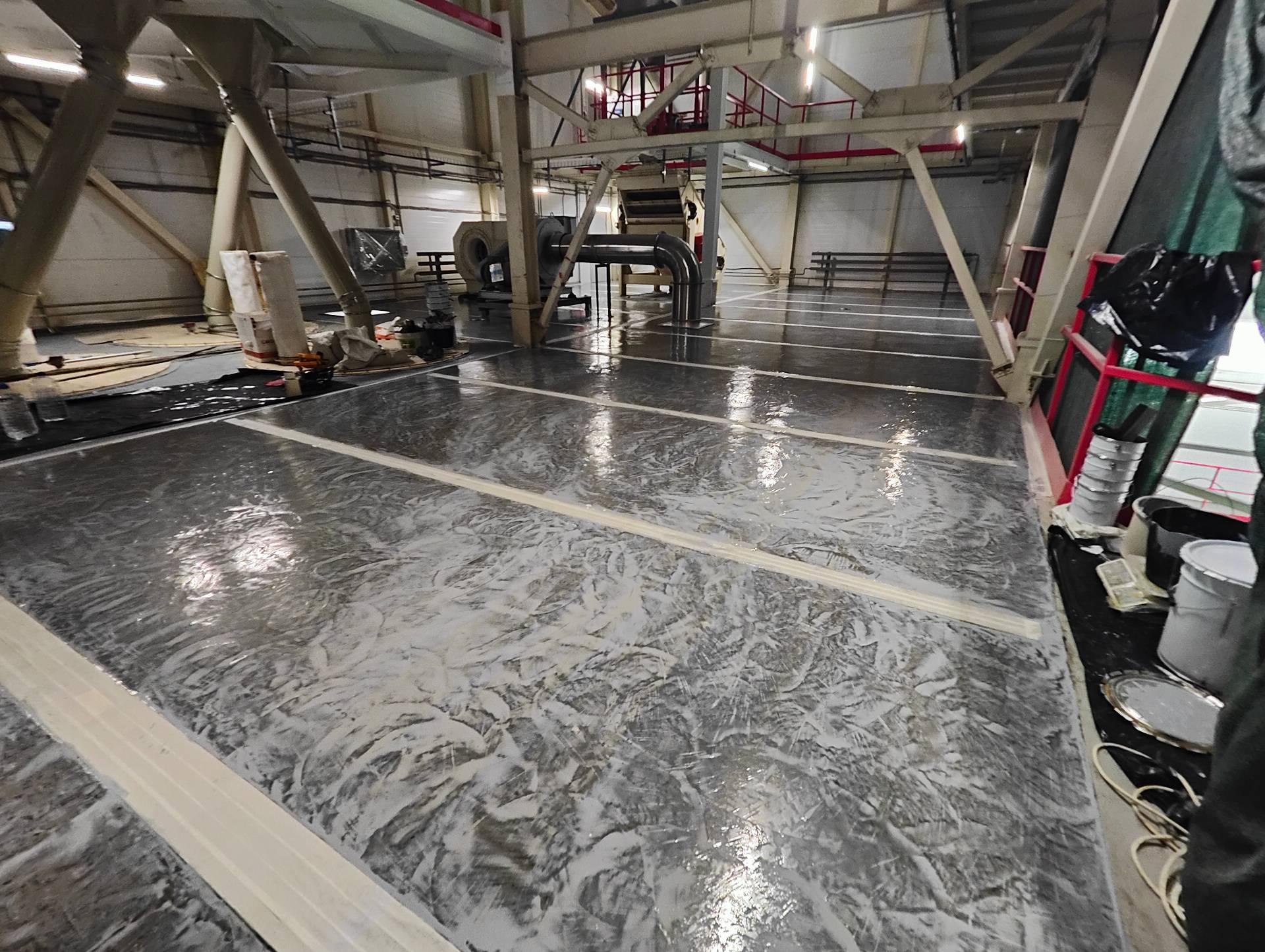 🔶 Наливное покрытие наносили секциями с последующей прокаткой игольчатым валиком.