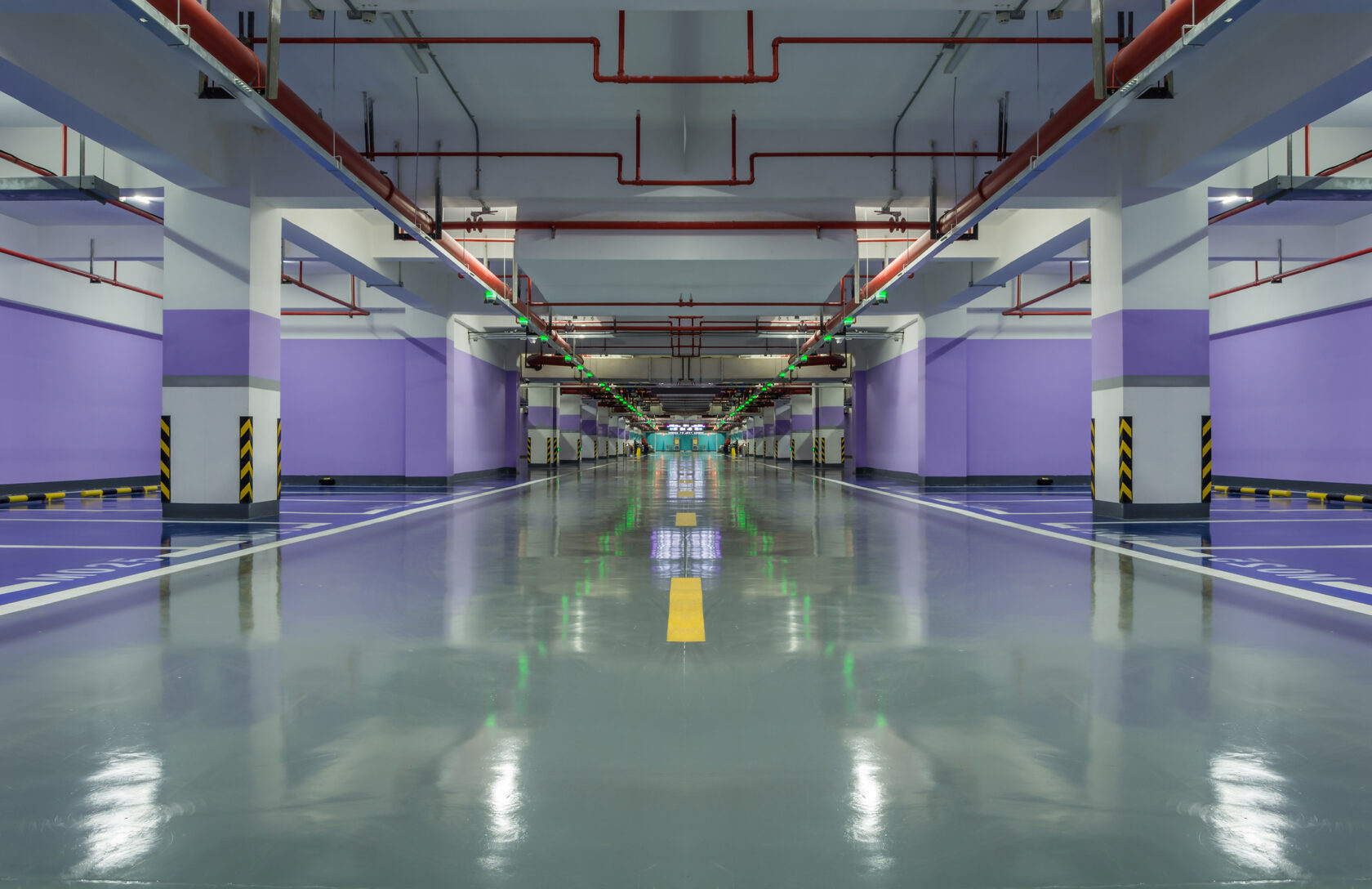 Например, эпоксидные полы подходят для паркингов, где покрытие постоянно контактирует с автомобилями. Машины ежедневно заезжают, тормозят, разворачиваются, оставляя следы от шин и абразивных частиц, которые попадают на поверхность с улицы. Даже при таком режиме эксплуатации эпоксидный слой сохраняет прочность, не истирается на «разворотных» участках и не разрушается под весом автомобилей.